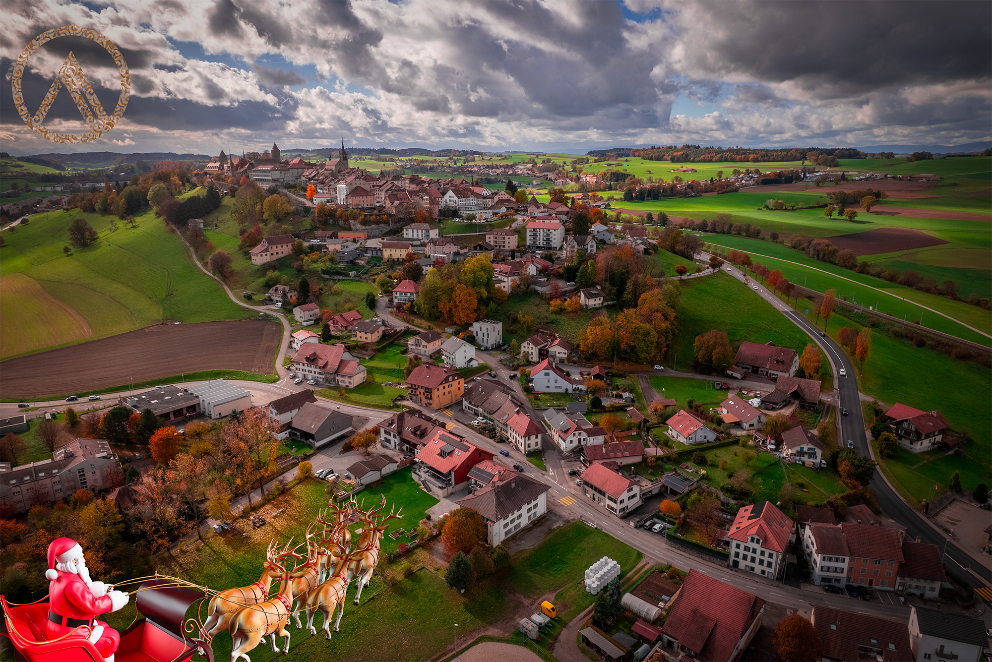 Santa reste vers le lac de Neuchâtel et prend un peu de hauteur, vers Payerne. Il pose son traîneau près du château de Montagny-les-Monts.