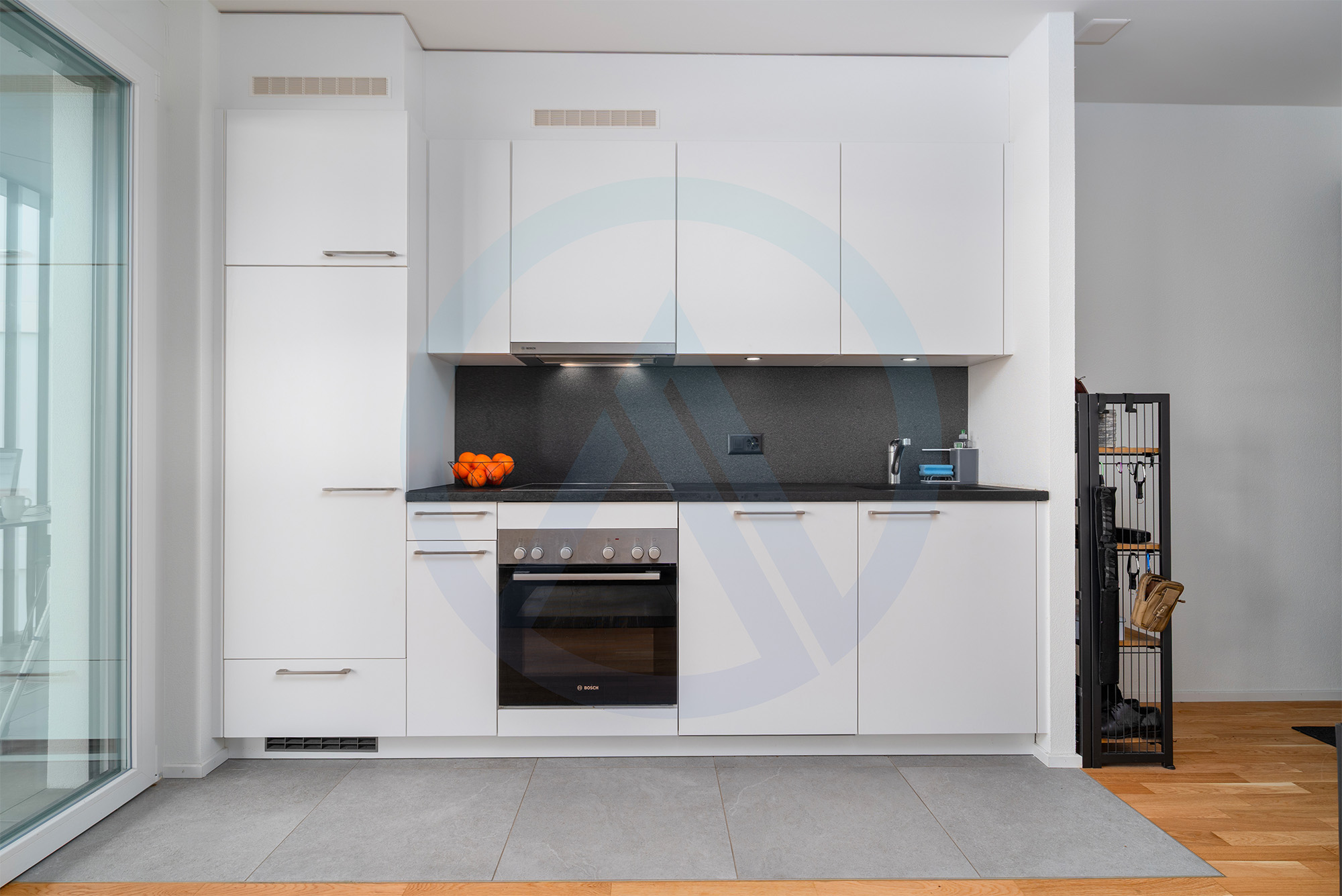 Entrée spacieuse, grande pièce à vivre avec cuisine ouverte entièrement aménagée, accès direct au balcon de 15 m². Salle de douche de 4,40 m² avec installation prévue pour lave-linge.